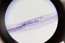 在顯微鏡底下看見透明的魚體,以及染色後骨頭的清晰線條,真是美麗的標本作品!
